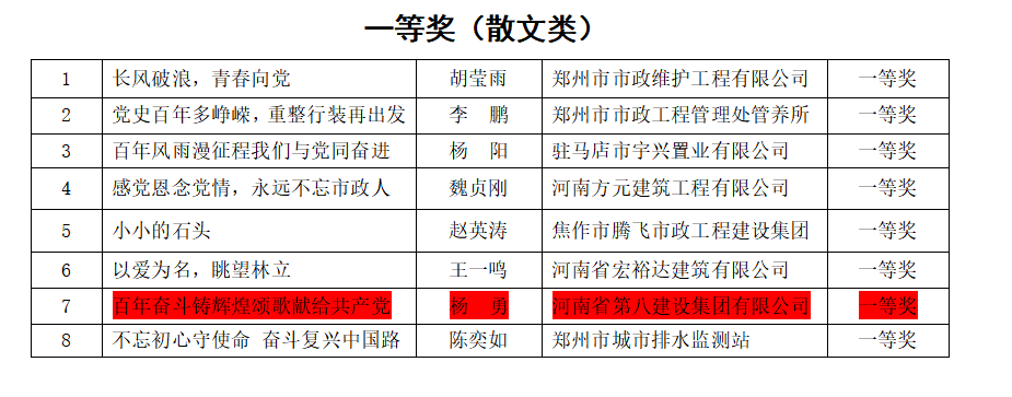 7月2日,由河南省市政公用業(yè)協(xié)會(huì)主辦的“百年奮斗鑄輝煌 頌歌獻(xiàn)給共產(chǎn)黨”慶祝中國(guó)共產(chǎn)黨建黨一百周年--河南省市政公用行業(yè)職工詩(shī)詞創(chuàng)作大賽作品評(píng)選結(jié)果揭曉。經(jīng)各級(jí)專業(yè)評(píng)委認(rèn)真遴選,全省范圍內(nèi)共評(píng)選出散文類一等獎(jiǎng)8篇、二等獎(jiǎng)15篇、三等獎(jiǎng)24篇、優(yōu)秀獎(jiǎng)22篇。其中,我公司楊勇同志的作品獲得散文一等獎(jiǎng)。
